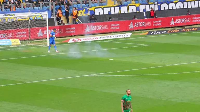 Maçın ilk düdüğü çalmadan önce maraton ve kale arkası tribünlerinden Amedspor oyuncularına yabancı maddeler atıldı.