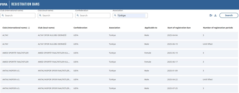 FIFA resmi sitesinde Antalyaspor'un 3 dosyadan transfer yasağı gözüküyor.